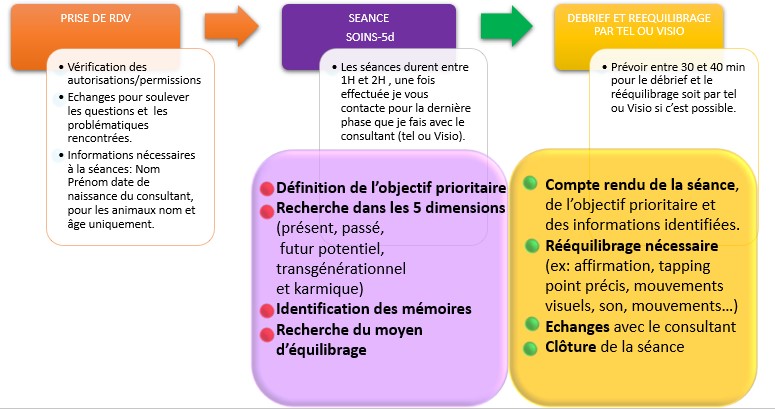 Je travaille sur un objectif prioritaire en accord avec mes consultant(e)s puis j’ interroge ces mémoires présente dans le champs informationnel de mes consultant(e)s dans le présent, le passé , le futur (potentialités d’expériences), le trans-générationnel (mémoires héritées) et le karmique (vie antérieures ou parallèles). Toutes ces informations mise en lumière se libèrent, permettant de faire place à de nouveaux modes de fonctionnement et je finalise la séance par un rééquilibrage (ré-information).